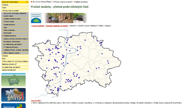 Mapa a seznam větší části zbraslavských studánek na ENVIS (informační systém o životním prostředí v Praze)